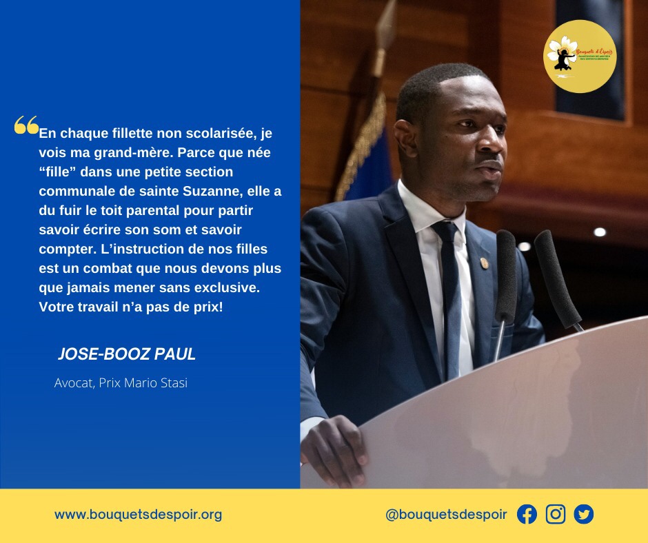 En chaque fillette non scolarisée, je vois ma grand-mère. Parce que née “fille” dans une petite section communale de sainte Suzanne, elle a du fuir le toit parental pour partir savoir écrire son som et savoir compter. L’instruction de nos filles est un combat que nous devons plus que jamais mener sans exclusive.