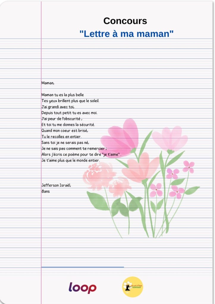 Jefferson Israël, 8 ans, est l’un des gagnants et gagnantes du concours épistolaire « Lettre à ma maman » organisé par notre association en partenariat avec le média LoopHaiti à l’occasion de la fête des mères. Découvrez son texte ici.