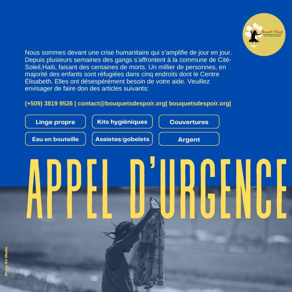 Dans un message publié sur leur page facebook le 26 juillet dernier, l’organisme œuvrant dans l’éducation des enfants a écrit: « Depuis plusieurs semaines des gangs s’affrontent à la commune de Cité Soleil, Haïti, faisant des centaines de morts. Un millier de personnes, en majorité des enfants, se sont réfugiées dans cinq endroits dont le Centre Élisabeth. Face à cette situation alarmante et désobligeante qui touche la catégorie la plus précaire, qui sont les enfants, l’Association Bouquets d’Espoir se mobilise pour apporter son soutien essentiel à ces enfants. Ils ont désespérément besoin de votre aide. » a écrit l’orgaisme humanitaire créé en Octobre 2019.